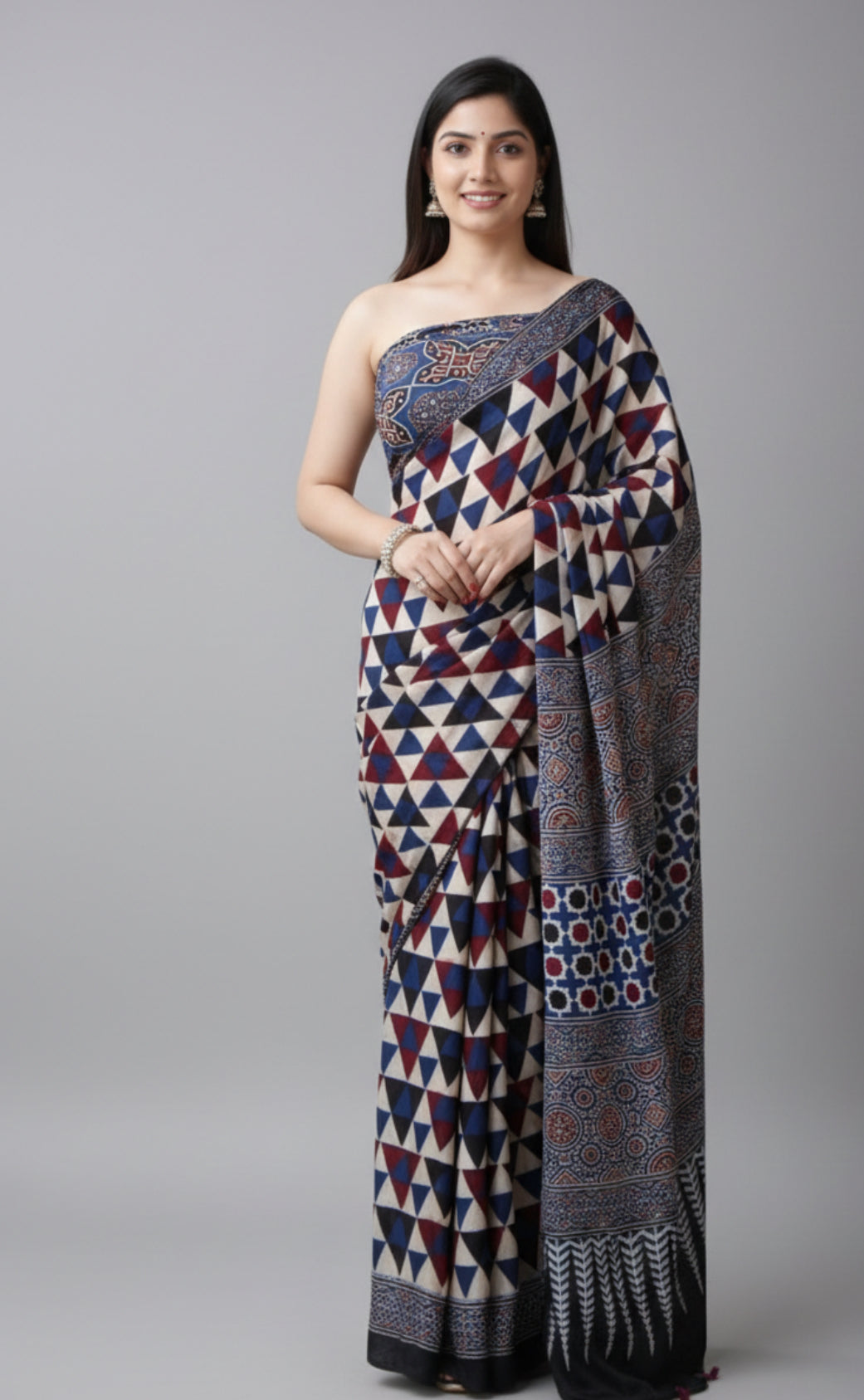 Elevate your ethnic wardrobe with this stunning Handcrafted Ajrakh Print Saree, featuring a rich blend of navy blue, maroon, and ivory geometric patterns. Inspired by traditional indian block printing , this saree showcases intricate detailing on the pallu and border, making it perfect for festive occasions, office wear , and casual parties.